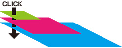 クリックしたのはgreenのdiv領域だけなのに、なぜ他のdivもアラートが表示されるのでしょうか? 理解のポイントはdivの入れ子構造です。左図のようにイメージしてください。greenのdiv領域はredやblueの内部にあるため、その背後にはredやblueのdiv領域が存在しているのです。そしてクリックすると、矢印のようにイベントは奥のdiv領域にも伝わっていくのです。greenのdiv領域はredのdiv領域内にあります。ですからgreenのdiv領域もredのdiv領域になるため、redがクリックに反応するのも自然なのです。階層で説明するとイベントは深いタグ階層から浅いタグ階層に伝わるとなります。