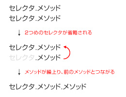 jQueryではセレクタが同じ場合はメソッドをまとめることができます。考え方としては左図のように、後ろの処理のセレクタを省略しメ、ソッドを繰上て前のメソッドに連結します。